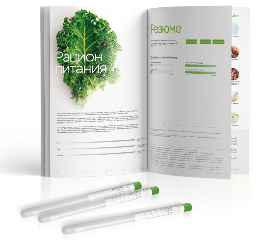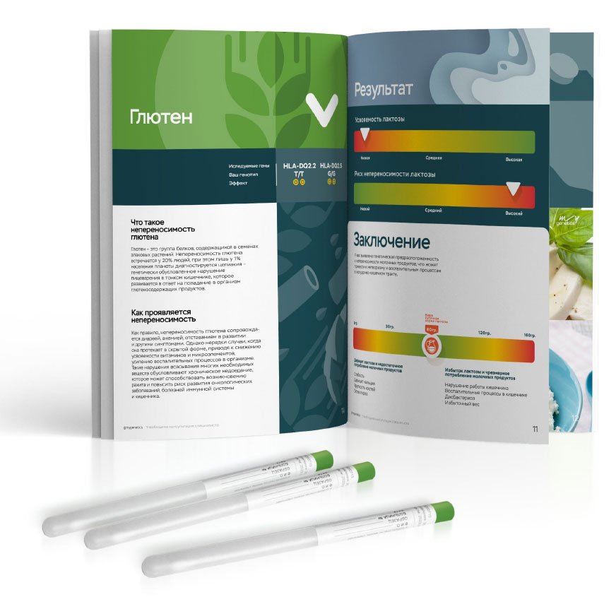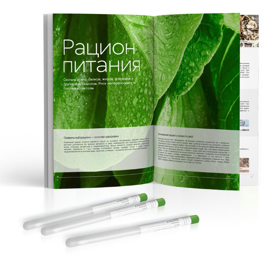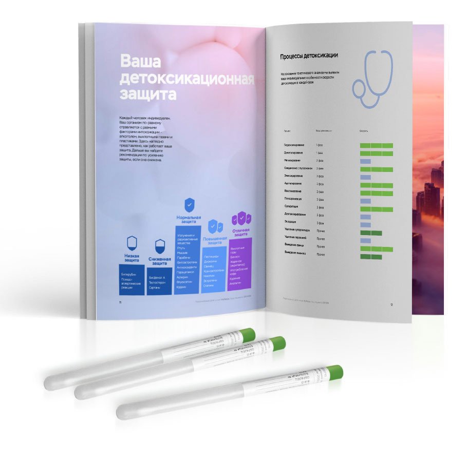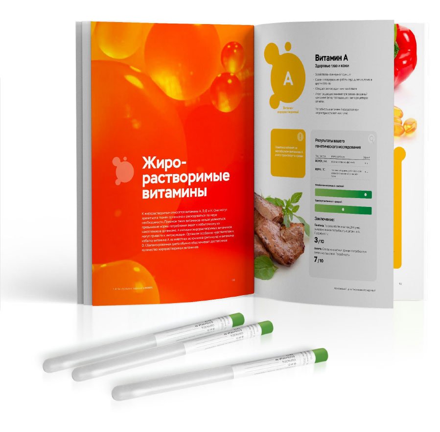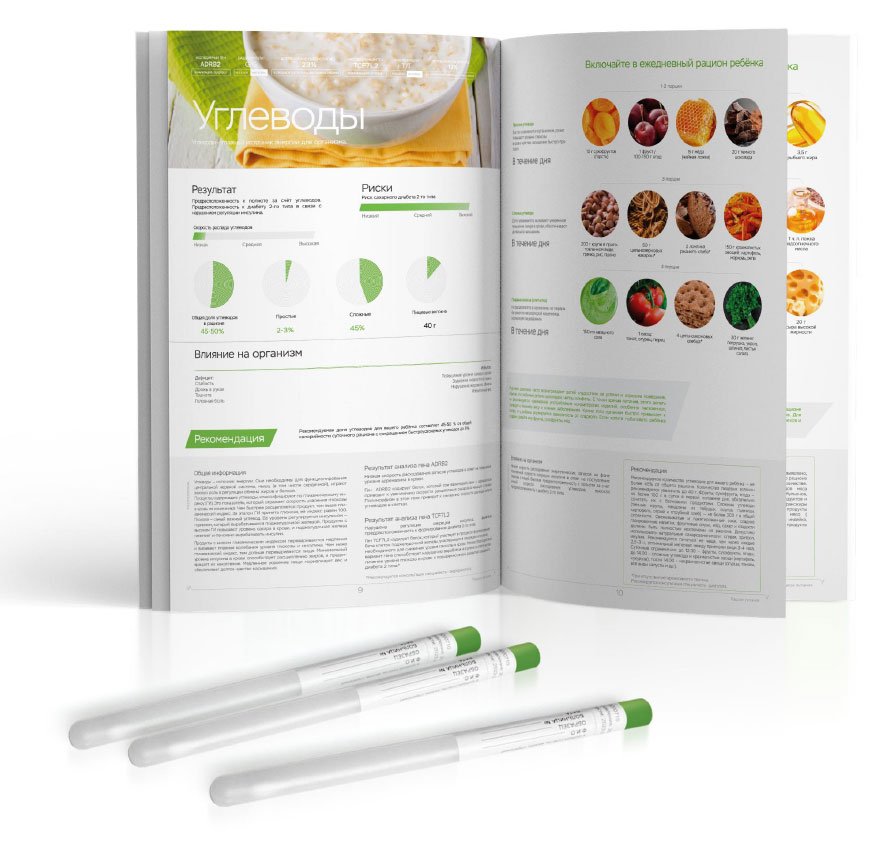 Рекомендован для детей до 12 лет. Помогает скорректировать рацион, узнать о пищевых непереносимостях, подобрать форму витаминов/минералов и генетически подходящий вид спорта, а также узнать риски ожирения, диабета 2 типа и воспалений ЖКТ.