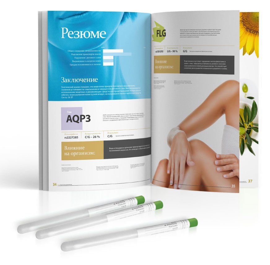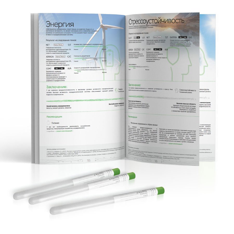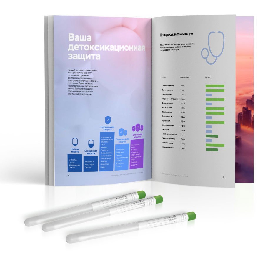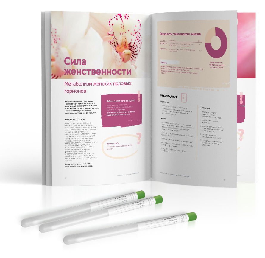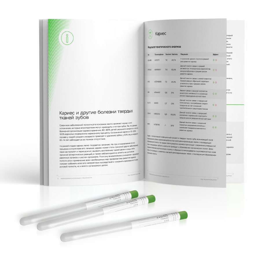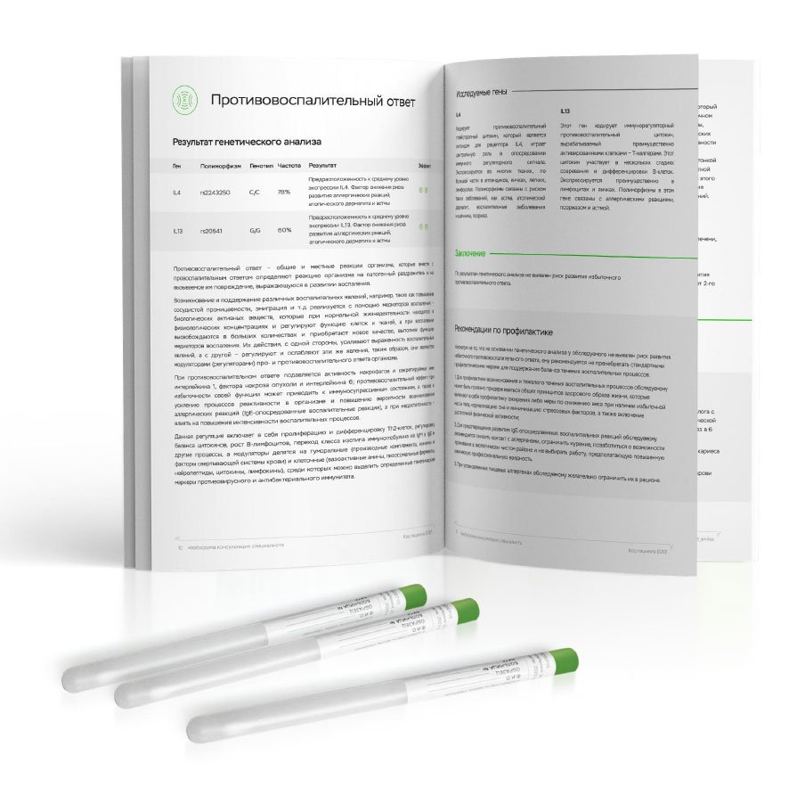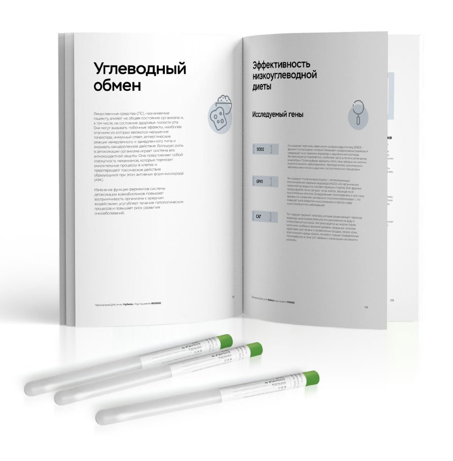 Рекомендован для детей до 12 лет. Помогает скорректировать рацион, узнать о пищевых непереносимостях, подобрать форму витаминов/минералов и генетически подходящий вид спорта, а также узнать риски ожирения, диабета 2 типа и воспалений ЖКТ.